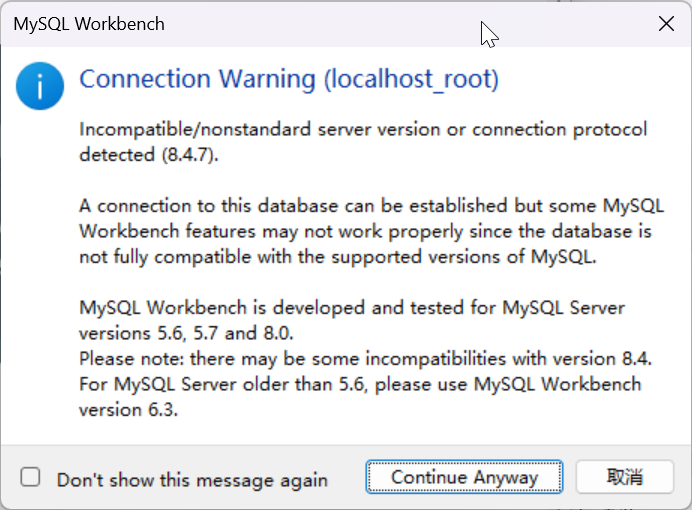 目前 Workbench 还没有和8.4.7精确匹配的版本,不过不要紧,也可以用。安装后打开会有个提醒: