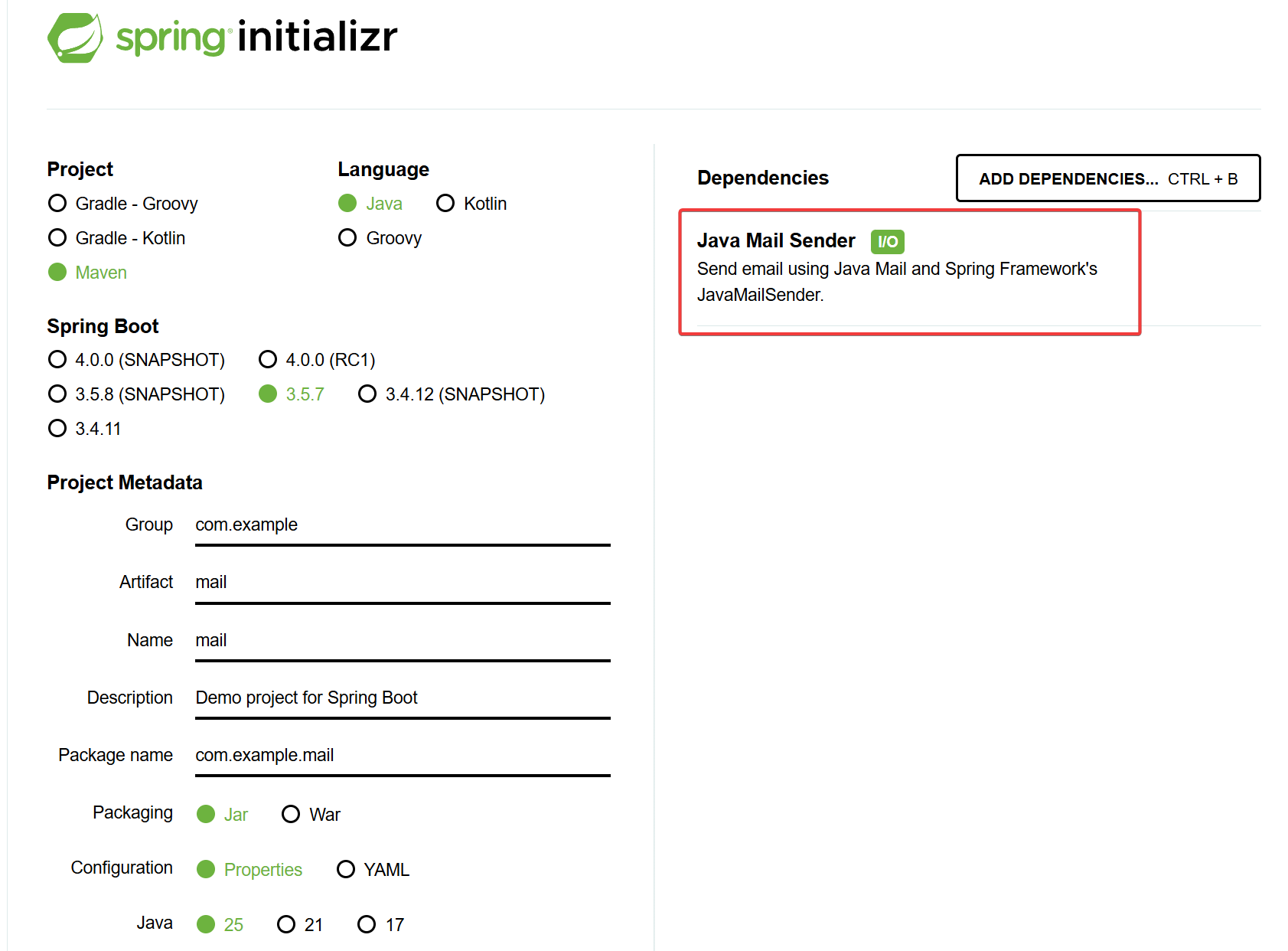 在 Spring Initializr 中选择 Java Mail Sender 创建工程即可。本实验只做最简单的演示,所以只选这个就行了。